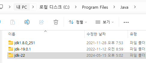 "C:\Program Files\Java" 폴더로 이동하면 아래와 같이 "jdk-22"가 설치된 것을 확인할 수 있습니다.